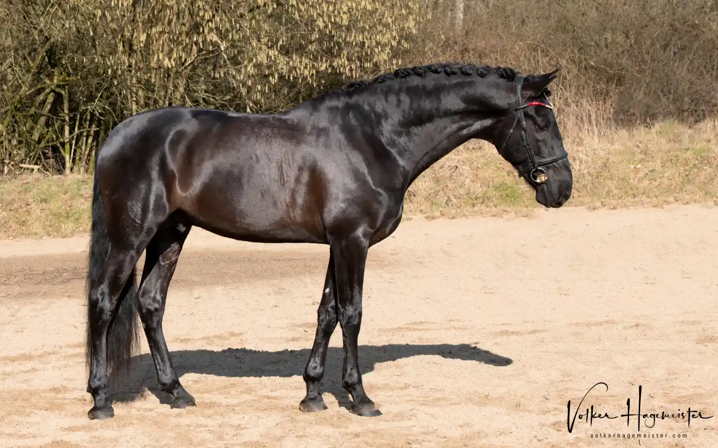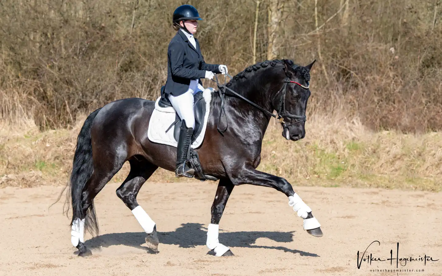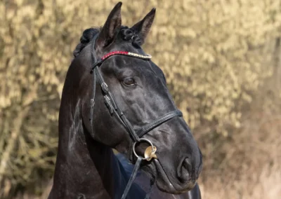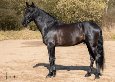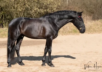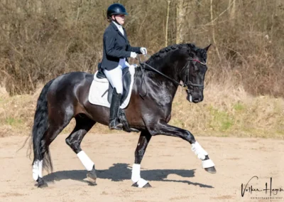 Austral Ducal is a 6-year-old black Pura Raza Espanola stallion with an impressive height of 1.77 metres. He is still at the beginning of his gentle training as a dressage stallion. In his training, he is already showing his great willingness to learn, his extreme freedom of shoulder and his talent for collection. In 2024, he was presented exclusively by his young rider Ava and was always able to hold his own against strong competition at shows in northern Germany. He also won with a score of 8.5 and the judges see great potential in him. His modern sport type paired with his Spanish look make him an eye-catcher at every show. He was calm and composed even when the teams marched up to the Schleswig Holstein State Championships with over 200 horses. He was also always praised for his rideability and perspective at seminars with well-known trainers. He is a true gentleman in handling, with a Spanish temperament that can be handled at any time. He also jumps very well and safely and is a relaxed hacking horse.